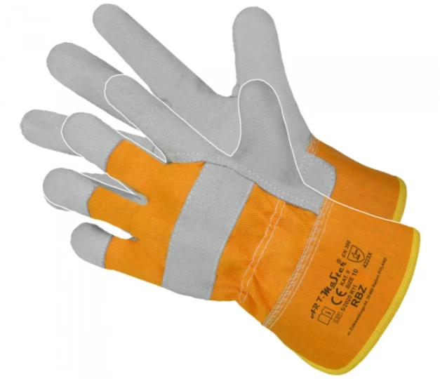 Rękawice wzmocnione skórą, całodłonicowe, część chwytna wykonana z bardzo dobrej jakości skóry dwoinowej bydlęcej. Część wierzchnia wykonana z tkaniny drelichowej, powyżej mankietu wszyta ściągająca taśmą.