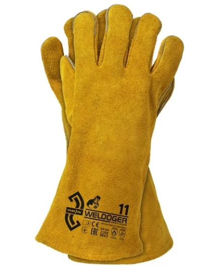 Rękawice spawalnicze wykonane ze skóry bydlęcej dwoinowej o długości 35 cm. Szyte trudnopalnymi nićmi z kevlaru, w wersji całodłonicowej, gdzie część chwytna powstała z jednego płata skóry, co zwiększa odporność na przetarcia. W całości skórzane, z mankietem sięgającym połowy przedramienia, chronią przed przemiękaniem i urazami. Wewnętrzna bawełniana podszewka zapewnia komfort, a biza wzmacnia i zabezpiecza szwy. Przystosowane do pracy w strefach narażonych na iskrzenie, odporne na ciepło kontaktowe do 100°C, klasyfikacja TYP A.