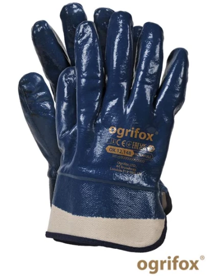 Rękawice ochronne powlekane nitrylem, zwiększające odporność na smary, oleje, tłuszcze i węglowodory. Wykonane z bawełny typu jersey, zapewniają komfort użytkowania. Zakończone usztywnianym mankietem.