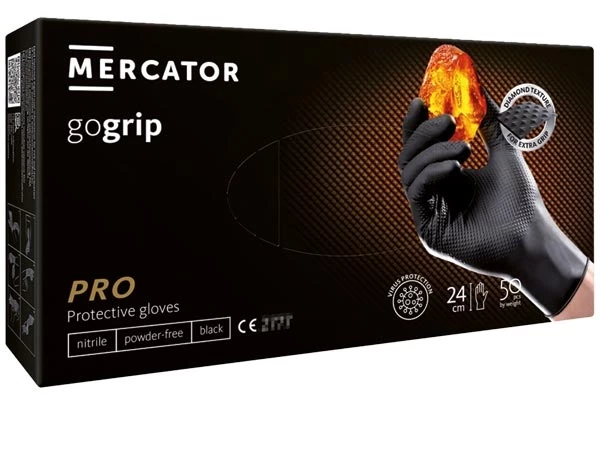 Rękawice nitrylowe gospodarcze i ochronne, bezpudrowe, zapewniają wysoki poziom zabezpieczenia przed niebezpiecznymi substancjami oraz czynnikami zakaźnymi. Diamentowa tekstura gwarantuje doskonałą przyczepność, zwłaszcza w środowisku mokrym i zaolejonym, a jednocześnie umożliwia precyzyjne manipulacje. Uniwersalne – pasują na prawą i lewą rękę – oraz dopuszczone do kontaktu z żywnością. Stanowią środek ochrony indywidualnej kategorii III. Pakowane po 50 sztuk.