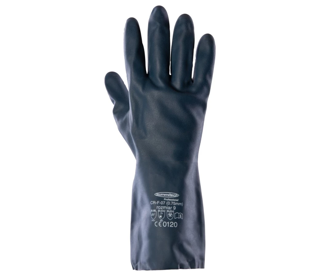 Model o długości 330 mm i grubości 0,75 mm wykonany jest z mieszanki neoprenowo-lateksowej w kolorze granatowym, co zapewnia bardzo dobrą wytrzymałość, elastyczność oraz skuteczną ochronę przed chemikaliami. Wnętrze wyścielone naturalnym, bawełnianym flokiem podnosi komfort użytkowania i ułatwia zakładanie rękawic. Anatomicznie ukształtowana część chwytna gwarantuje dobre dopasowanie do dłoni i wygodę podczas długotrwałej pracy.