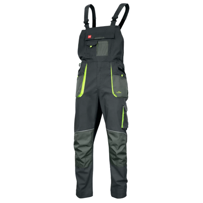 Ogrodniczki ochronne w kroju slim, wykonane z elastycznej i wytrzymałej tkaniny typu canvas (60% bawełna, 38% poliester, 2% spandex). Rozciągliwe w czterech kierunkach, dobrze dopasowane do sylwetki, nie krępują ruchów. Potrójne szwy, ryglówki oraz czarny klin wzmacniają narażone miejsca. Trzynaście kieszeni wzmocnionych tkaniną Oxford 600D, w tym kieszeń z klapką na rzep i szlufka na młotek. Kolanowe kieszenie na nakolanniki z otworem od dołu, również wzmocnione tkaniną Oxford. Zapinane z boku na guziki, z elastyczną regulacją pasa i dodatkowymi guzikami. Odblaskowe elementy z przodu. Niska kurczliwość i trwały kolor.