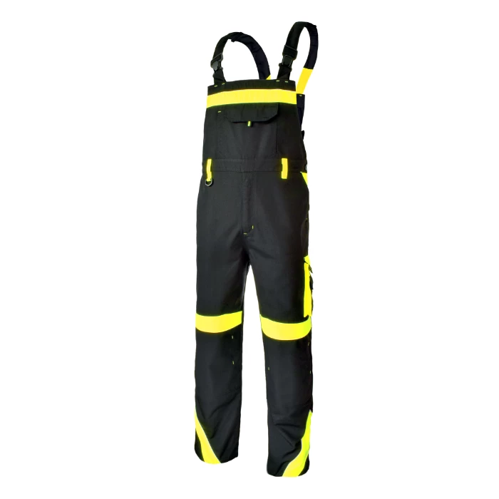 Spodnie ochronne typu ogrodniczki z wytrzymałej tkaniny CANVAS (65% poliester, 35% bawełna). Potrójne szwy i ryglówki wzmacniające narażone miejsca. Dziewięć funkcjonalnych kieszeni, w tym na metrówkę i długopisy. Kieszenie kolanowe na nakolanniki zapinane na rzep. Zapięcie z przodu na suwak. Regulacja pasa bocznymi guzikami i regulowane szelki. Odblaskowe elementy z przodu i z tyłu. Niska kurczliwość, trwały kolor. Kolor czarno-żółty. Spełniają normę EN ISO 13688:2013. Kategoria CE 1.