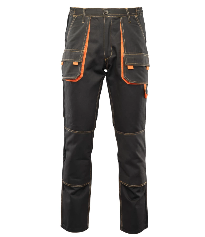 Spodnie wykonane z wysokiej jakości materiału, który nawet po wielokrotnym praniu zapewnia stabilność rozmiarów, 100% bawełna, 300g/m2, dwie kieszenie w tylnej części spodni, wzmocnione kieszenie boczne, kieszeń na miarkę „metrówkę”.