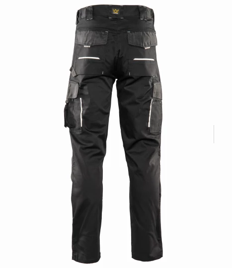 Wyposażone w liczne, praktycznie rozmieszczone kieszenie: wzmocnione kieszenie boczne, dwie tylne, kieszeń na telefon, dokumenty, długopisy oraz miarkę. Szlufka na młotek oraz ergonomiczna kieszeń na nakolanniki z tkaniny OXFORD zwiększają funkcjonalność modelu. Podwójne szwy, ryglówki oraz mocne nici zapewniają trwałość konstrukcji, a elementy odblaskowe poprawiają widoczność i bezpieczeństwo pracy.