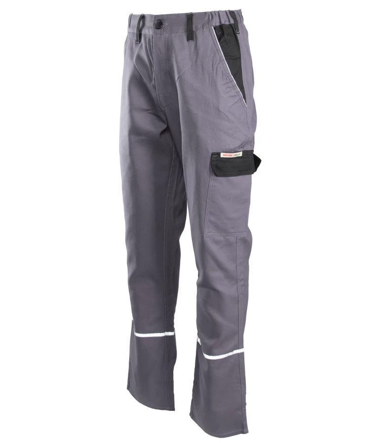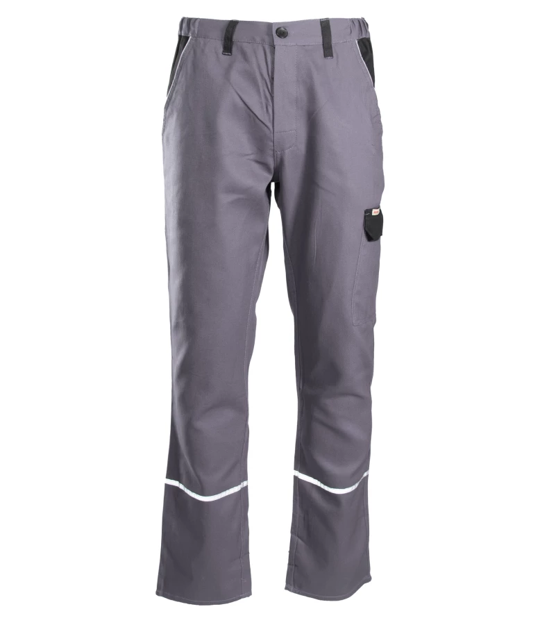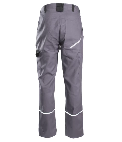 Spodnie robocze wykonane w 100% z wysokogatunkowej bawełny o gramaturze 270 g/m². Wyposażone w funkcjonalne kieszenie, w tym na dokumenty i miarkę. Posiadają pasy i lamówki odblaskowe zwiększające widoczność oraz wstawki kolorystyczne. Zapewniają stabilność rozmiarów nawet po wielu praniach. Spełniają normę EN ISO 13688:2013.