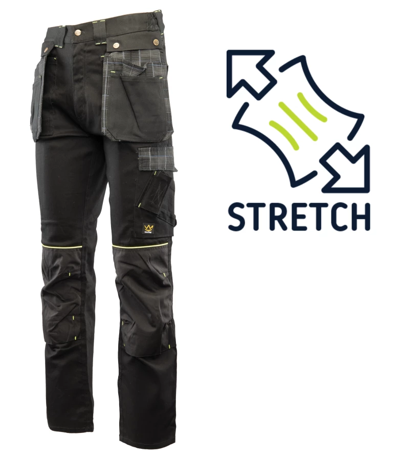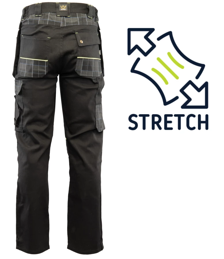Spodnie robocze wykonane z trwałego i elastycznego materiału (97% bawełna, 3% spandex) o gramaturze 300 g/m², zachowują stabilność rozmiarów nawet po wielu praniach. Posiadają wstawki w modną kratkę, kontrastową lamówkę oraz podwójne szwy wzmacniane mocną nicią i ryglówki w miejscach szczególnie narażonych na rozprucie. Wyposażone w szlufki na pasek oraz liczne praktyczne kieszenie: boczne, tylne, na telefon, dokumenty, miarkę i ergonomiczne kieszenie na nakolanniki z CORDURY. Dodatkowo posiadają dwie odpinane kieszenie monterskie. Spełniają wymagania normy EN 13688, kategoria ochrony I.