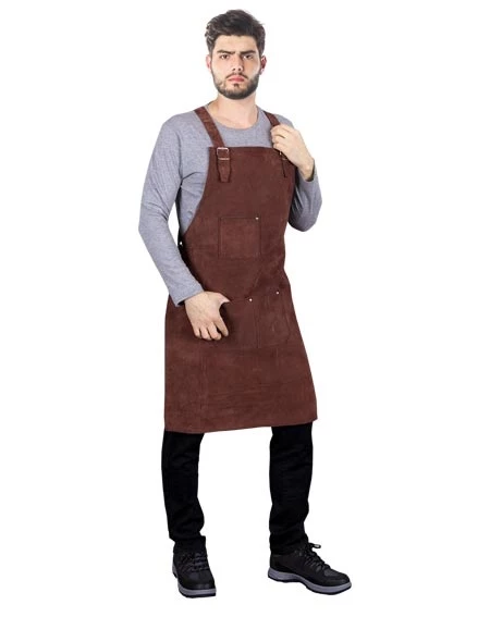 Skórzany fartuch przedni wykonany z jednego płata zamszowej skóry bydlęcej dwoinowej o grubości 1,2–1,6 mm, wyposażony w regulowane paski zapinane z przodu na metalowe klamry oraz trzy praktyczne kieszenie (dwie centralne i jedną w górnej części); idealny dla rzemieślników, stanowi zabezpieczenie przed działaniami minimalnego ryzyka oraz powierzchniowymi czynnikami mechanicznymi.