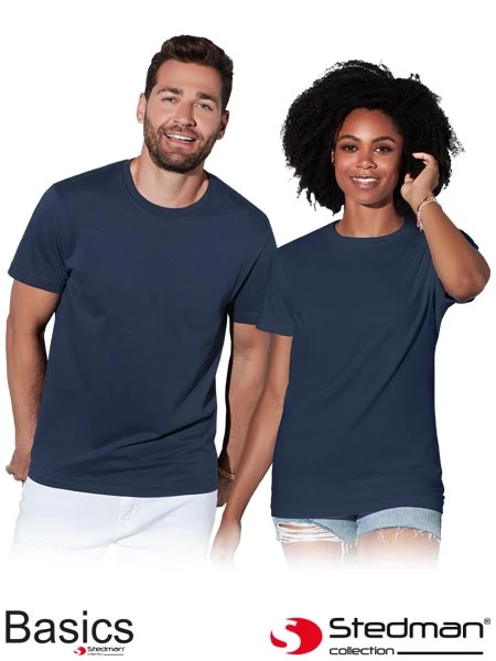 100% wysokogatunkowej bawełny, jednołożyskowej (kolor szary: 85% bawełny/15% wiskozy); gramatura 155 g/m² bez szwów bocznych; taśma wzmacniająca szwy rękawów