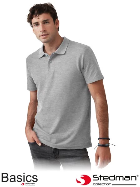 100% bawełny o splocie pique (kolor szary: 85% bawełny/15% wiskozy); gramatura 170 g/m²; szwy boczne; taśma wzmacniająca na karku; rękawki bez ściągaczy; 2 guziki w kolorze rogu