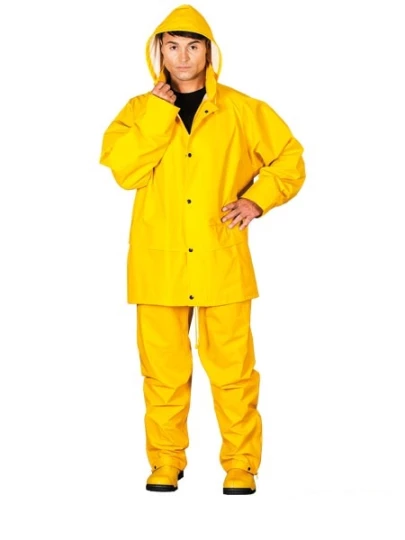 Wysokiej jakości komplet przeciwdeszczowy z materiału o wysokiej wytrzymałości z PU/PCV. Kurtka: zapięcie na suwak. Dwie duże kieszenie w dolnej część kurtki. Spodnie: wykończone w pasie gumką. Dodatkowe napy w pasie.