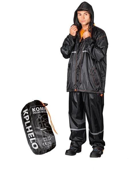 Komplet przeciwdeszczowy w skład którego wchodzą spodnie do pasa i kurtka. 35% PCV, 65% poliester. Zawiera odblaski. Klejone szwy. Kurtka: zapięcie na suwak z napami; system wentylacji pod pachami. Spodnie: wykończone w pasie rozciągliwą gumką.