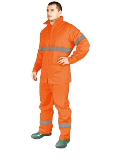 Komplet przeciwdeszczowy w skład którego wchodzą spodnie do pasa i kurtka. 35% PCV, 65% poliester. Zawiera odblaski. Klejone szwy. Kurtka: zapięcie na suwak; system wentylacji pod pachami. Spodnie: wykończone w pasie rozciągliwą gumką.