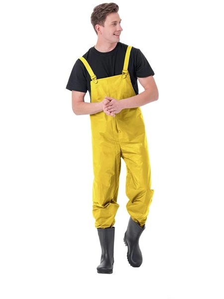 Spodnie ogrodniczki przeciwdeszczowe. 65% PVC, 35% poliester. Możliwość regulacji w długości szelkami i szerokości dzięki napom z tyłu spodni. Dodatkowe zapięcie u dołu spodni, dzięki czemu można zwęzić dół nogawek.