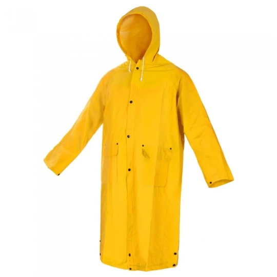 Wysokiej jakości płaszcz przeciwdeszczowy z kapturem z elastycznego materiału o wysokiej wytrzymałości. 100% PVC, wzmocniony podszewką poliestrową, zamek błyskawiczny zabezpieczony klapą zapinaną na napy, kieszenie w części przedniej.