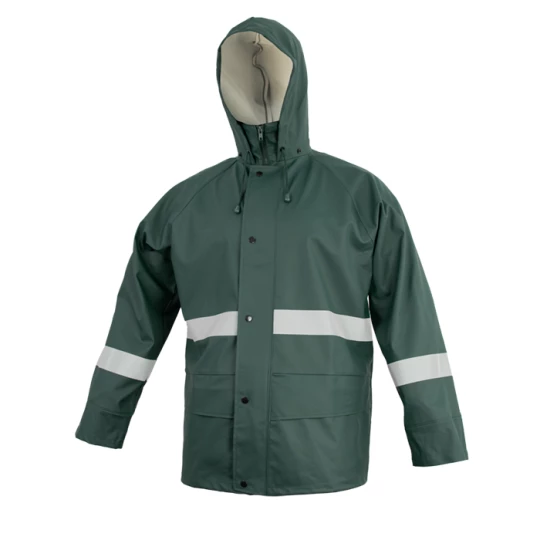 Kurtka przeciwdeszczowa, wykonana z wytrzymałego materiału z taśmami odblaskowymi. 100% poliuretan, wzmocniony dzianiną poliestrową. Dwie kieszenie zapinane na zatrzask z przodu, zamek błyskawiczny zabezpieczony listwą zapinaną na zatrzaski.