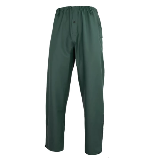 Spodnie przeciwdeszczowe, wykonane z wytrzymałego materiału. 100% poliuretan, wzmocnione dzianiną poliestrową. Ściągacz z gumką w pasie. Nogawki posiadają zapięcia na napy do regulacji szerokości spodni.