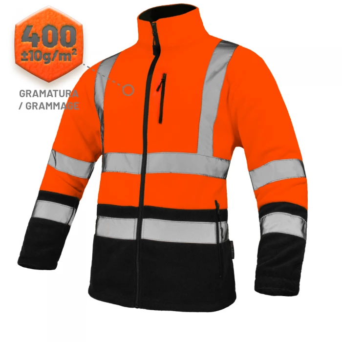 Bluza polarowa wyposażona w pasy odblaskowe. 100% poliester. Gramatura 400 g/m². Pasy odblaskowe na torsie i rękawach. Zapinana na suwak. Rękaw zakończony gumką. 2 kieszenie zewnętrzne zapinane na suwak. Dół bluzy regulowany sznurkiem.