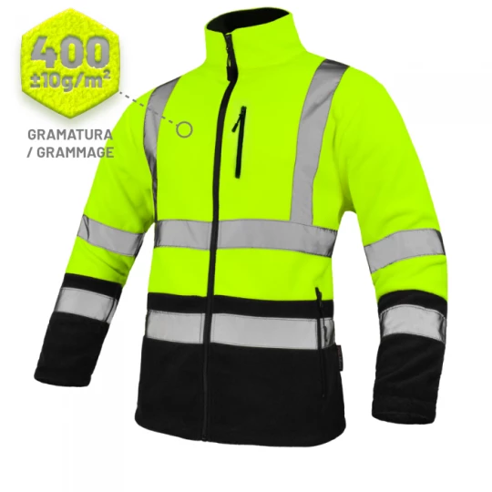 Bluza polarowa wyposażona w pasy odblaskowe. 100% poliester. Gramatura 400 g/m². Pasy odblaskowe na torsie i rękawach. Zapinana na suwak. Rękaw zakończony gumką. 2 kieszenie zewnętrzne zapinane na suwak. Dół bluzy regulowany sznurkiem.