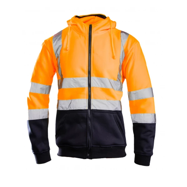 Bluza robocza z poliestru (280 g/m²), wyposażona w zamek kostkowy i wysoki kołnierz. Posiada ściągacze w pasie i rękawach, dwie kieszenie boczne oraz regulowany kaptur. Wstawki kolorystyczne i pasy odblaskowe zapewniają lepszą widoczność.