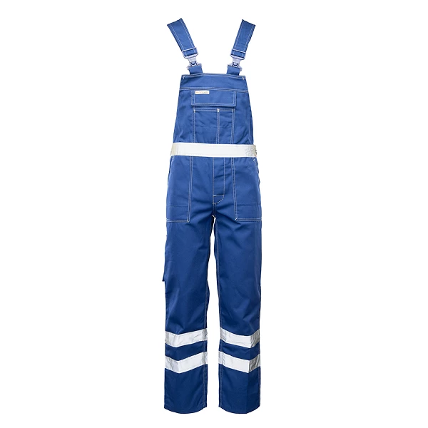 Ogrodniczki robocze z długimi, regulowanymi szelkami, wykonane z trwałego materiału odpornego na pranie. Posiadają podwójne szwy, ryglówki i szlufkę na młotek. Wyposażone w liczne kieszenie, w tym na dokumenty, telefon i metrówkę, oraz taśmy odblaskowe.