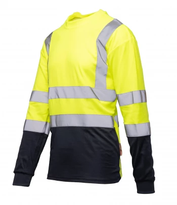 Koszulka ochronna z długim rękawem wykonana jest z elastycznej tkaniny o intensywnej widoczności, w składzie 50% poliester i 50% bawełna, o gramaturze 160 g/m². Materiał zapewnia komfort użytkowania oraz dobrą trwałość w codziennej pracy.