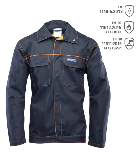 Bluza antystatyczna dla spawaczy. Wykonana z wysokiej jakości materiału. Bawełna 100%. 320g/m2. Zapinana na napy, kryta listwą. Dwie górne kieszenie zapinane na napy. Brak kieszeni bocznych. Regulacja bluzy w pasie na napy. Mankiety przy rękawach na napy.