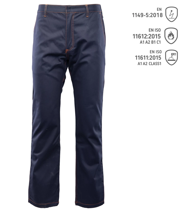 Spodnie antystatyczne dla spawaczy. Wykonane z wysokiej jakości materiału. Bawełna 100%. 320g/m2. Możliwość regulacji w pasie dzięki gumce. Dwie wzmocnione kieszenie boczne. Kieszeń na miarkę „metrówkę”.