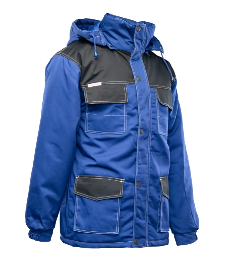 Kurtka robocza zapinana na zamek kryty listwą, wykonana z mieszanki 65% poliestru i 35% bawełny o gramaturze 290 g/m². Dzięki wysokiej jakości materiałowi zachowuje stabilność kolorów i rozmiarów nawet po wielokrotnym praniu. Ocieplenie z poliestru 200 g/m² oraz przedłużany tył zapewniają dodatkową ochronę przed zimnem. Podwójne szwy wykonane mocną nicią gwarantują trwałość. Kurtka wyposażona jest w dwie kieszenie boczne, kieszeń na telefon oraz dwie górne kieszenie zapinane na rzepy, w tym jedną krytą listwą. Mankiety zakończone są ściągaczem, dół ma regulowany obwód, a odpinany, regulowany i ocieplany kaptur zwiększa funkcjonalność. Na plecach umieszczono elementy odblaskowe poprawiające widoczność.