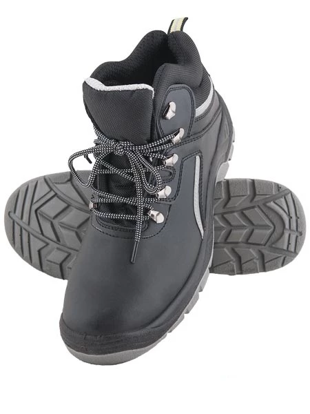 Trzewiki ze skóry licowej z ochronnym podnoskiem stalowym. Czarne z szarymi odblaskowymi wstawkami. Podeszwa PU/PU, antypoślizgowa, z absorpcją energii w części piętowej. Gumowe oblaniem chroniące czubek buta.