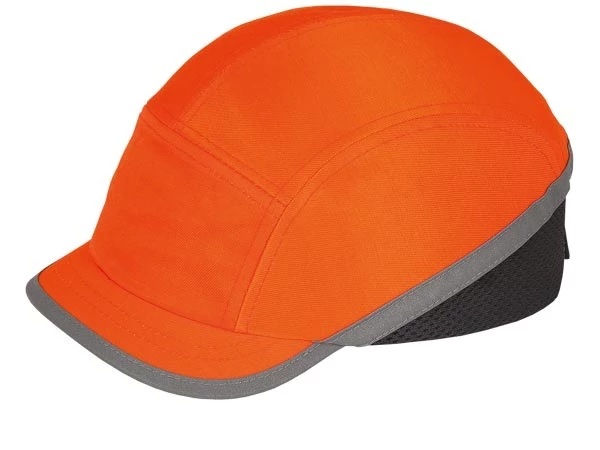 Przemysłowy hełm lekki typu bump cap z krótkim daszkiem, wykonany z mieszanki poliestru i bawełny, z wewnętrzną skorupą z ABS. Wyposażony w odblaskowe lamówki, siatkowe wstawki wentylacyjne oraz regulację obwodu. Spełnia normę EN 812 i zapewnia podstawową ochronę przed urazami.