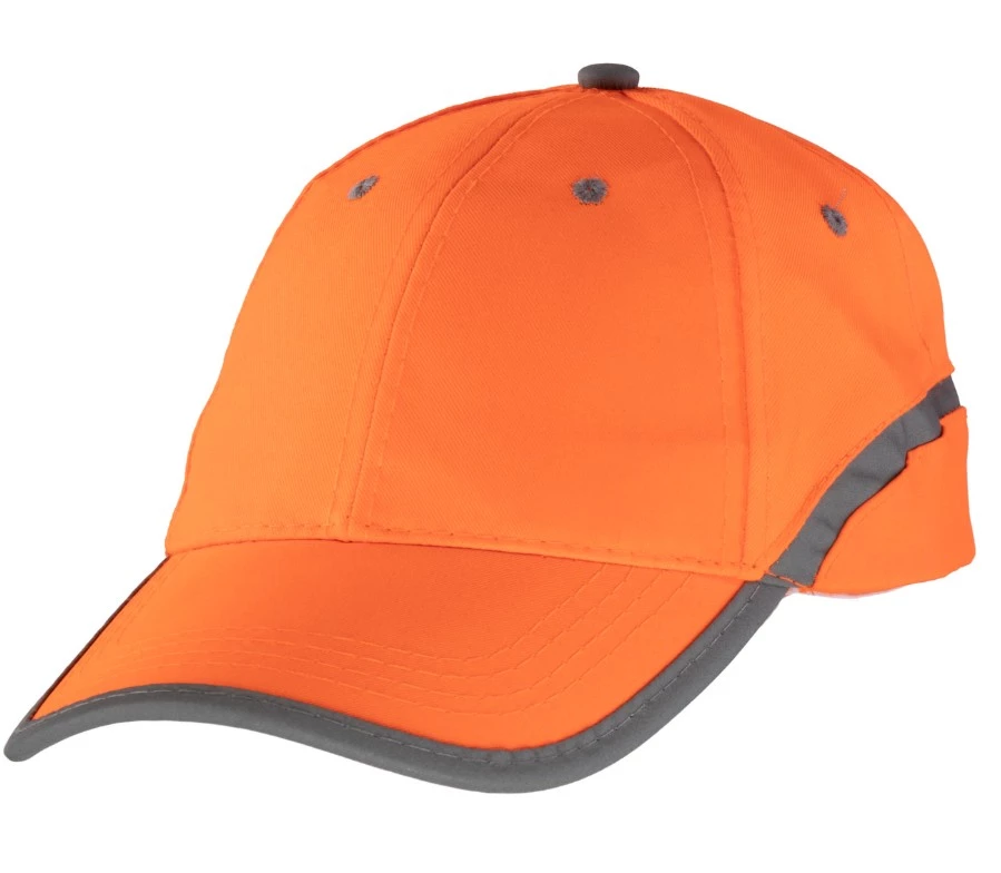 Czapka z daszkiem wykonana z 100% poliestru, lekka (ok. 180 g), z usztywnianym daszkiem i 6-panelową konstrukcją. Wyposażona w odblaskowy pasek zwiększający widoczność oraz regulację obwodu (54–62 cm) na rzep. Zgodna z normami EN ISO 12947-2 i EN ISO 13688.