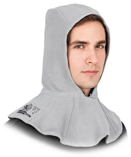 Kaptur spawalniczy wykonany ze skóry bydlęcej dwoinowej, z siateczkową podszewką (70% bawełna, 30% poliester) zapewniającą komfort noszenia; szyty trudnopalnymi nićmi z kevlaru, zapinany na rzep, lekki i wygodny, skutecznie chroni głowę oraz szyję podczas prac spawalniczych i ślusarskich.