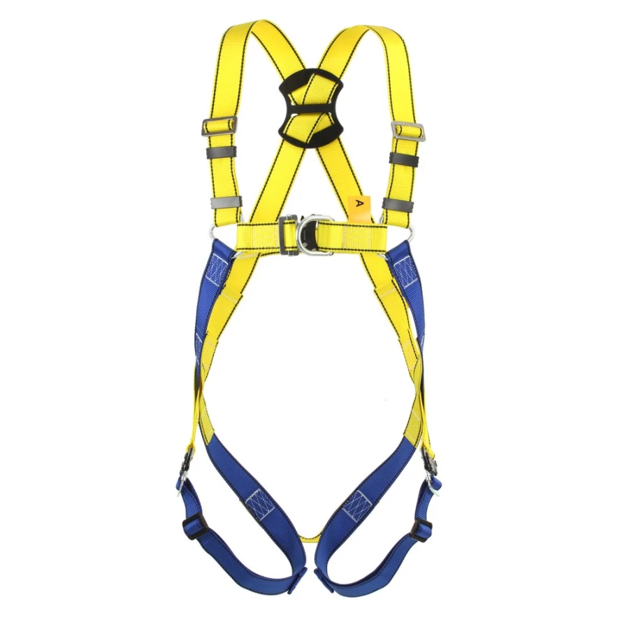 Szelki w kolorze żółto-niebieskim zapewniają dobrą widoczność w miejscu pracy, a cały system jest przystosowany do bezpiecznego dopasowania do sylwetki, umożliwiając komfortową regulację i stabilne mocowanie w punktach kotwiczenia zgodnie ze standardami ochrony indywidualnej przed upadkiem.