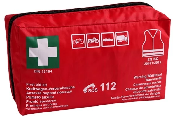 Apteczka pierwszej pomocy samochodowa wykonana z wodoodpornej tkaniny, zapinana na suwak i wyposażona w rzep do mocowania do tapicerki. Zawiera kompletne wyposażenie zgodne z normą DIN 13164:2022, umożliwiające szybkie udzielenie pomocy w nagłych sytuacjach na drodze. W zestawie znajdują się m.in. opatrunki, bandaże, rękawiczki, koc termiczny, maski medyczne, nożyczki oraz kamizelka ostrzegawcza. Przeznaczona do samochodów osobowych i ciężarowych, o kompaktowych wymiarach 24 × 15 × 6 cm.